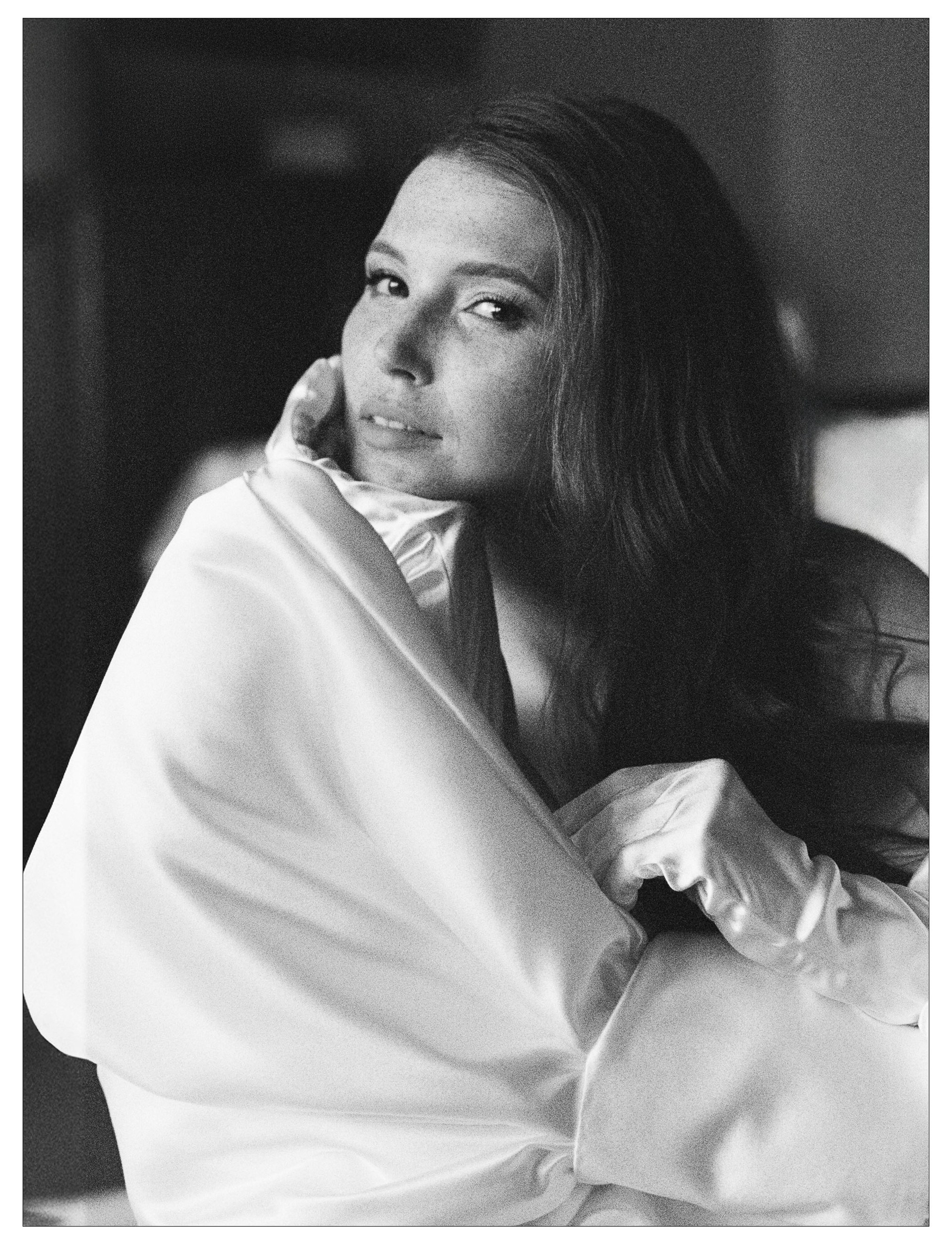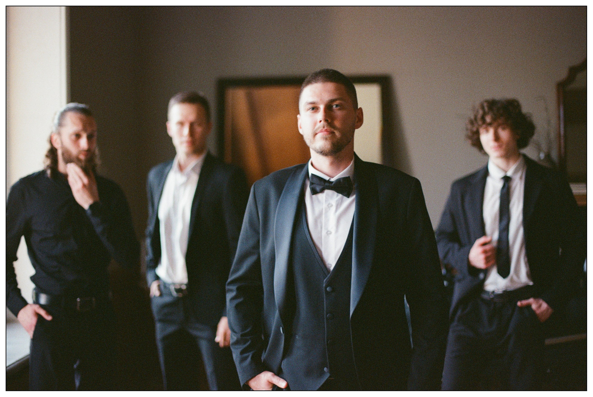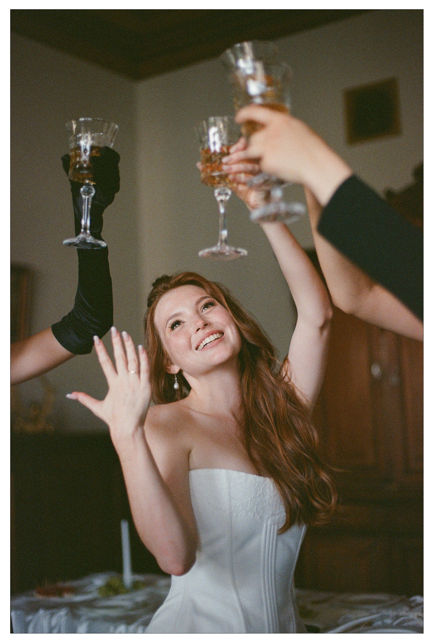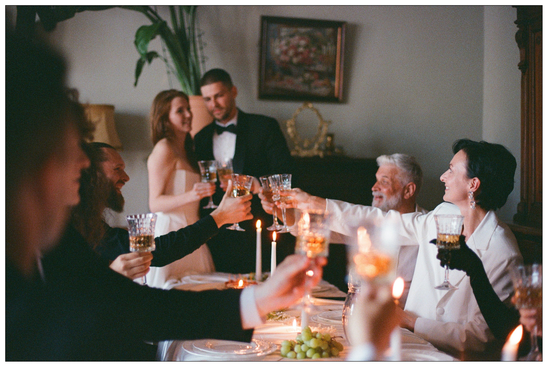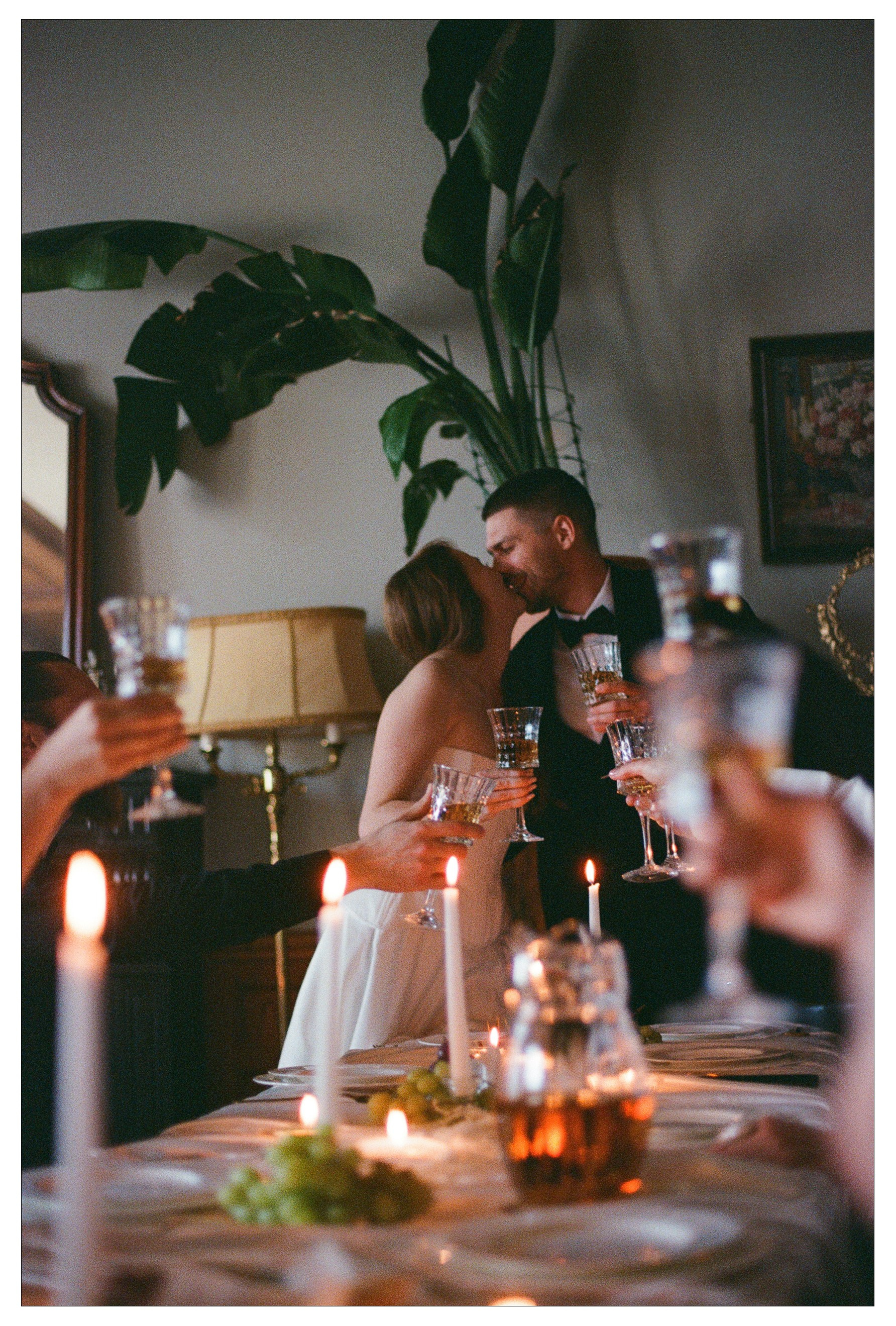 В кадрах — детали комнаты, фактуры тканей, настроение ожидания. После церемонии пара осталась в этих же интерьерах, и день прошёл камерно: рядом были только близкие люди, их разговоры и смех.
