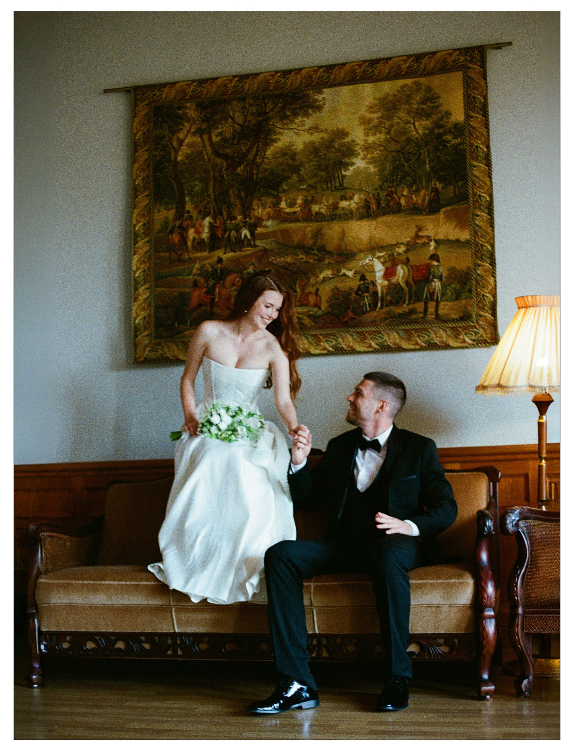 Пара решила провести свадьбу в пространстве с винтажным характером. Высокие потолки, старинная мебель, мягкий свет из больших окон — интерьер сразу задавал тон. Здесь не нужно было искать декорации: сама обстановка создавала атмосферу.