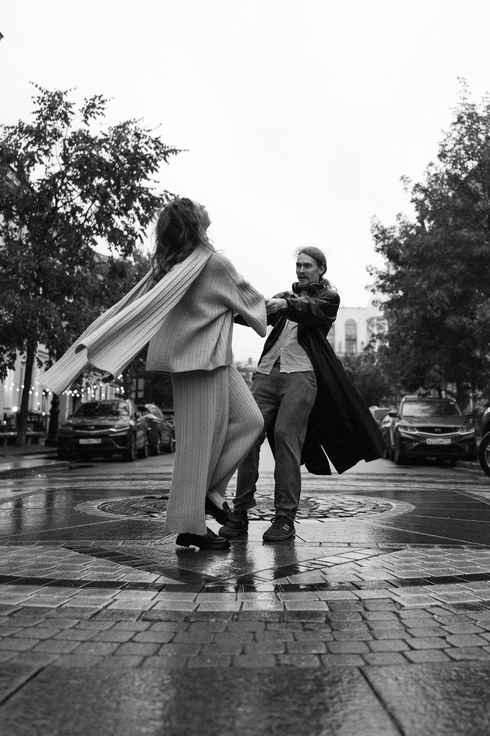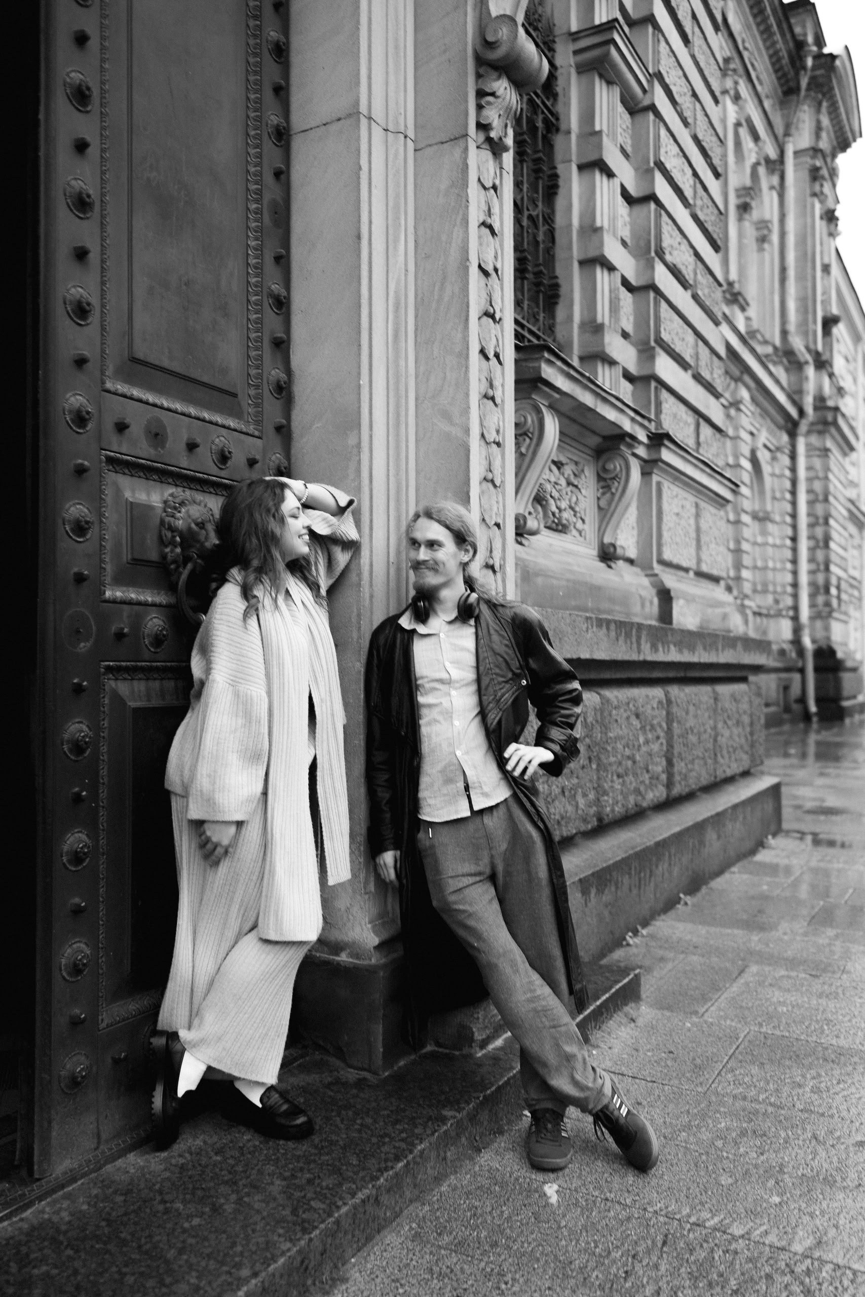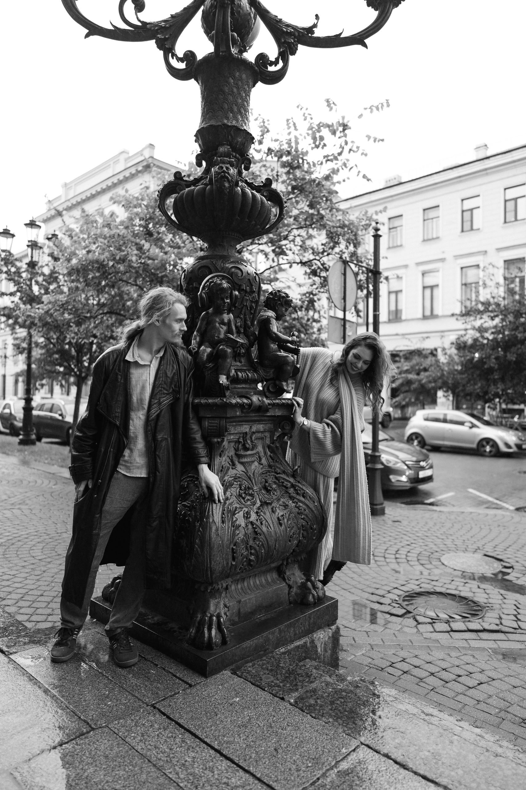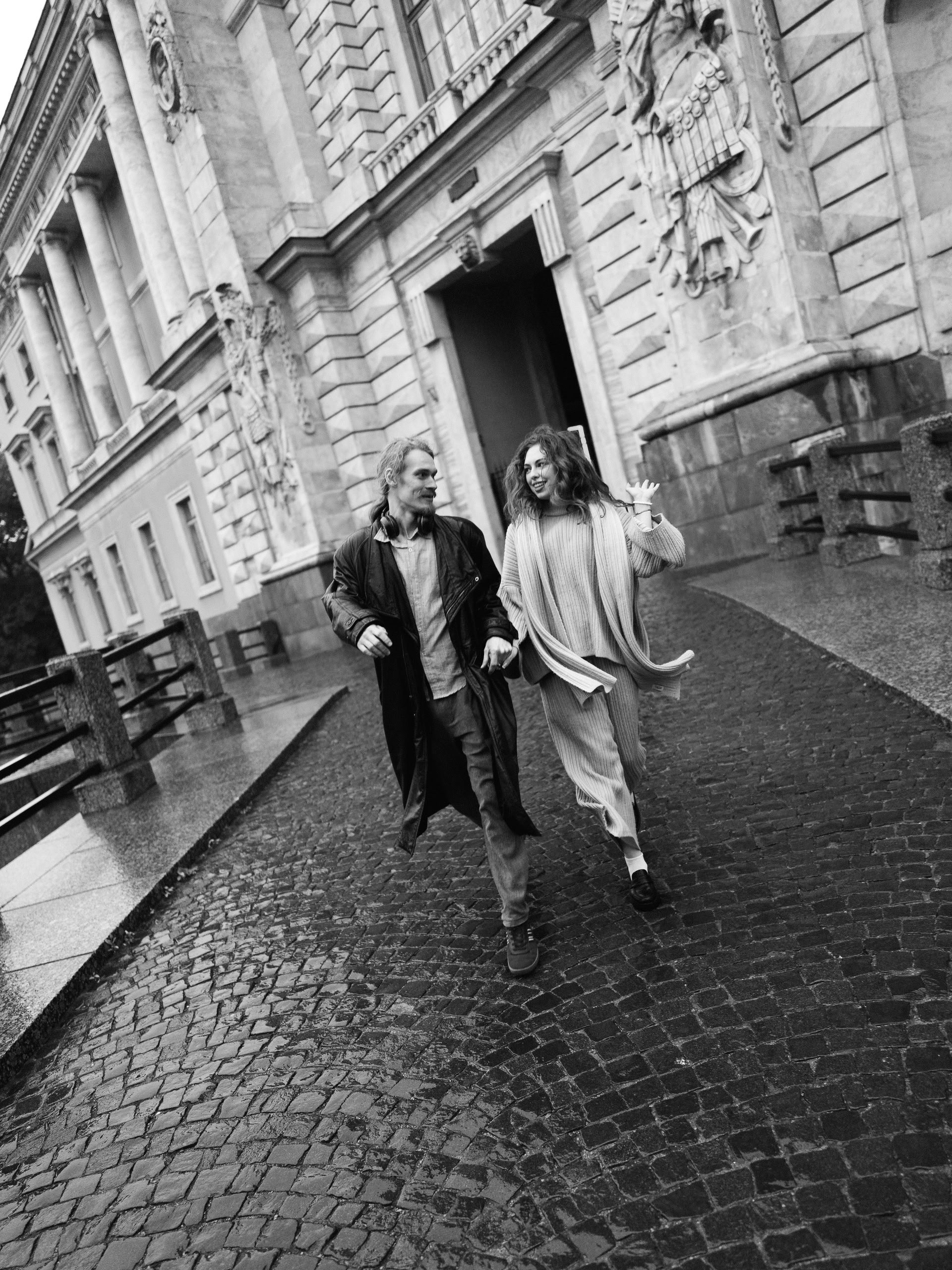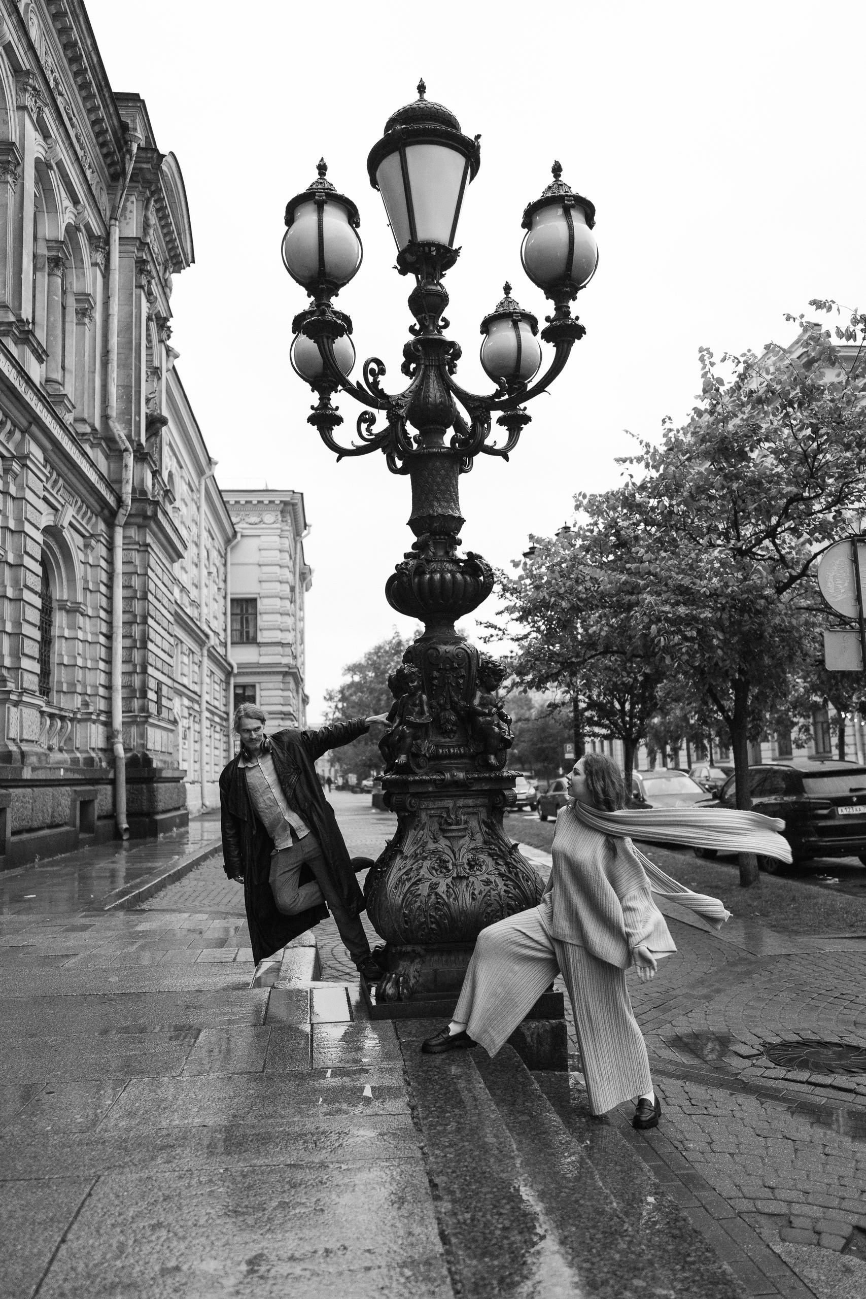 С Валерой и Олей мы всё спланировали заранее — они прилетели из Москвы, выбрали локации, обсудили стиль. Но в день съёмки Петербург устроил настоящий ливень, и вся наша подготовка чуть было не оказалась под водой — в прямом смысле.