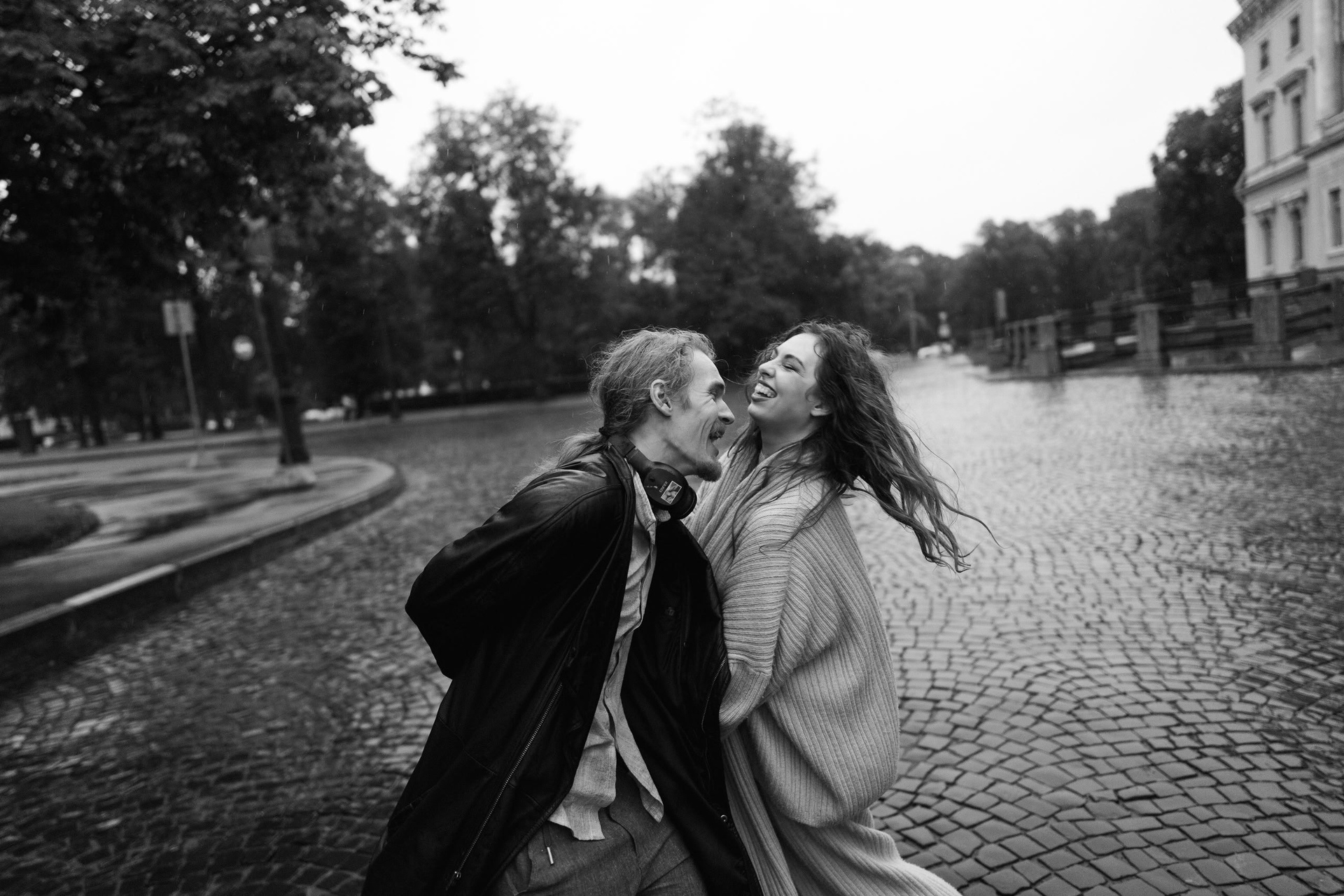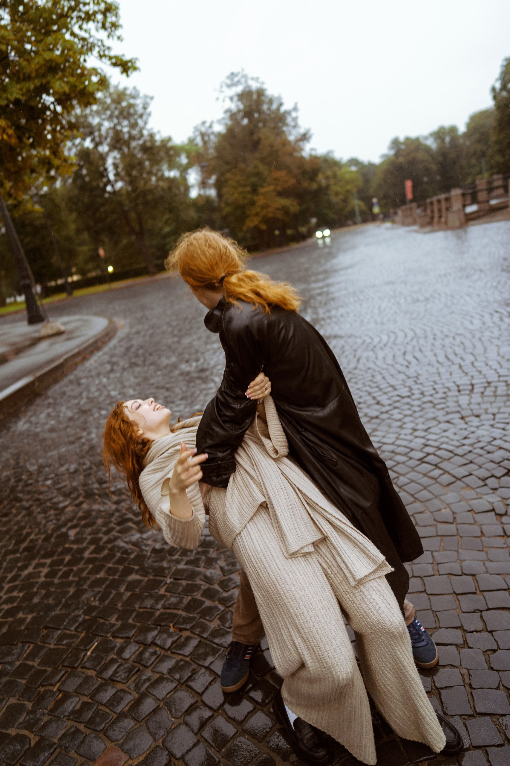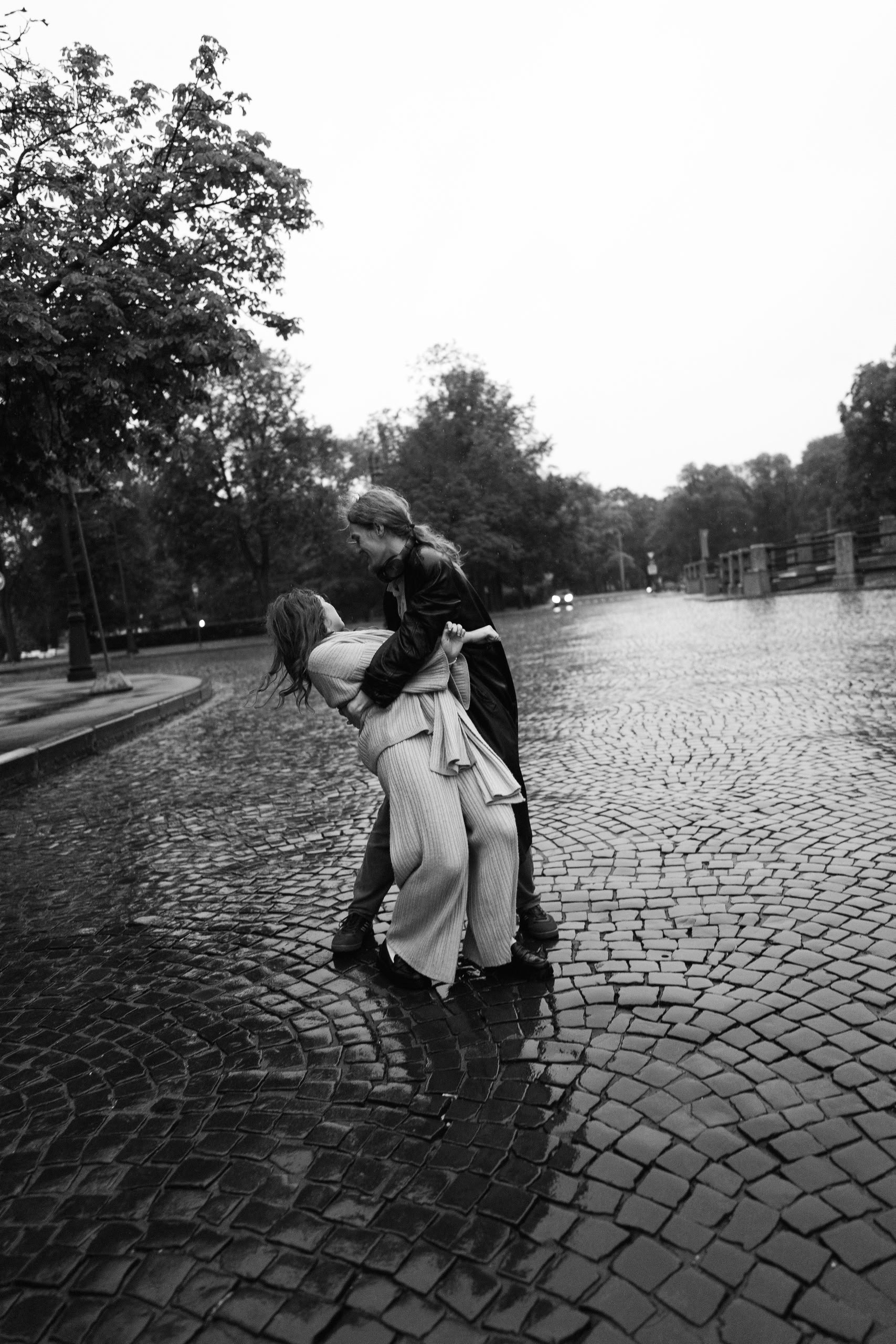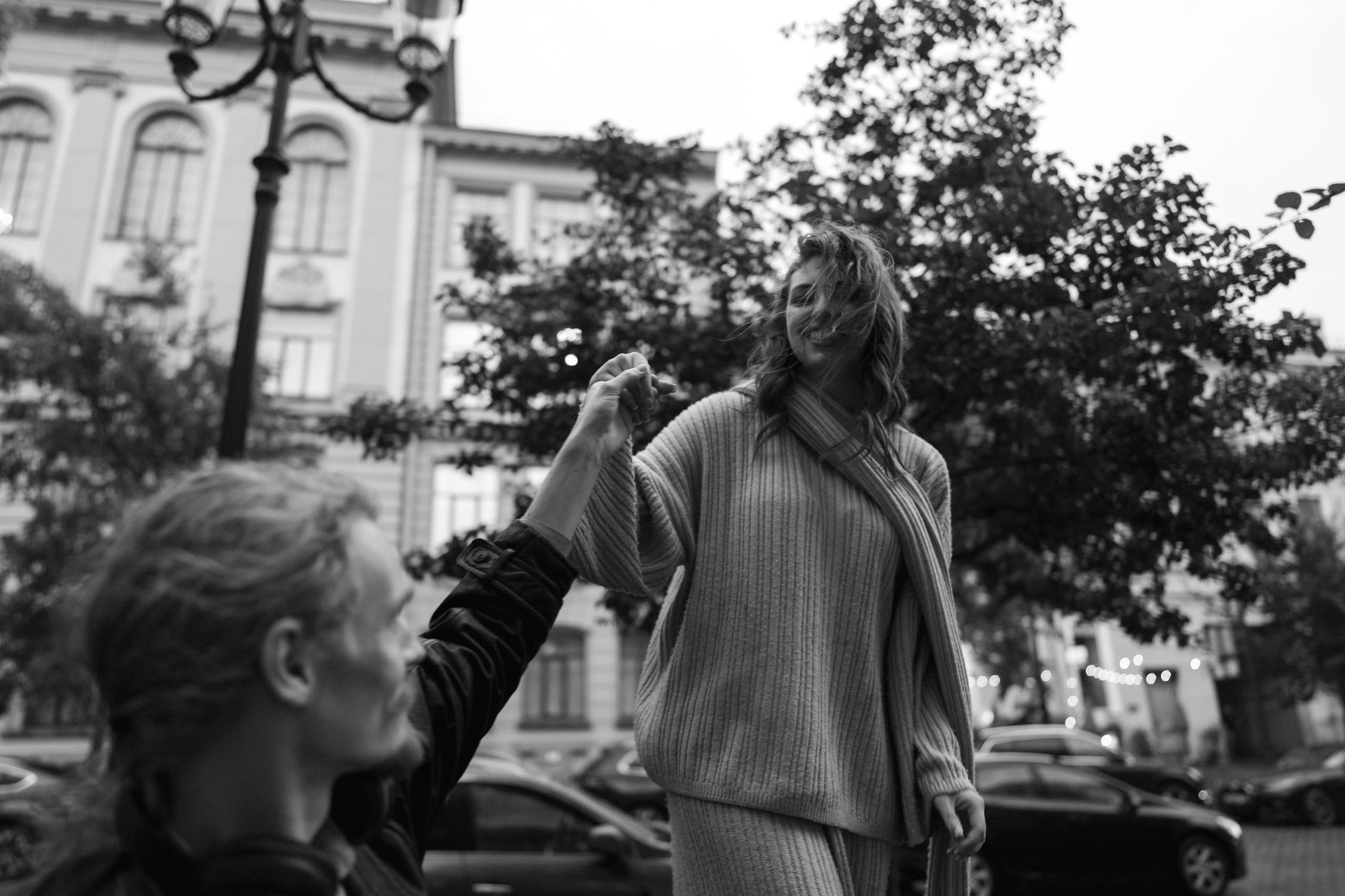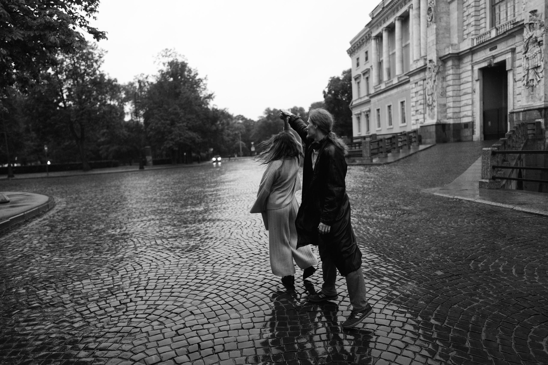 С Валерой и Олей мы всё спланировали заранее — они прилетели из Москвы, выбрали локации, обсудили стиль. Но в день съёмки Петербург устроил настоящий ливень, и вся наша подготовка чуть было не оказалась под водой — в прямом смысле.