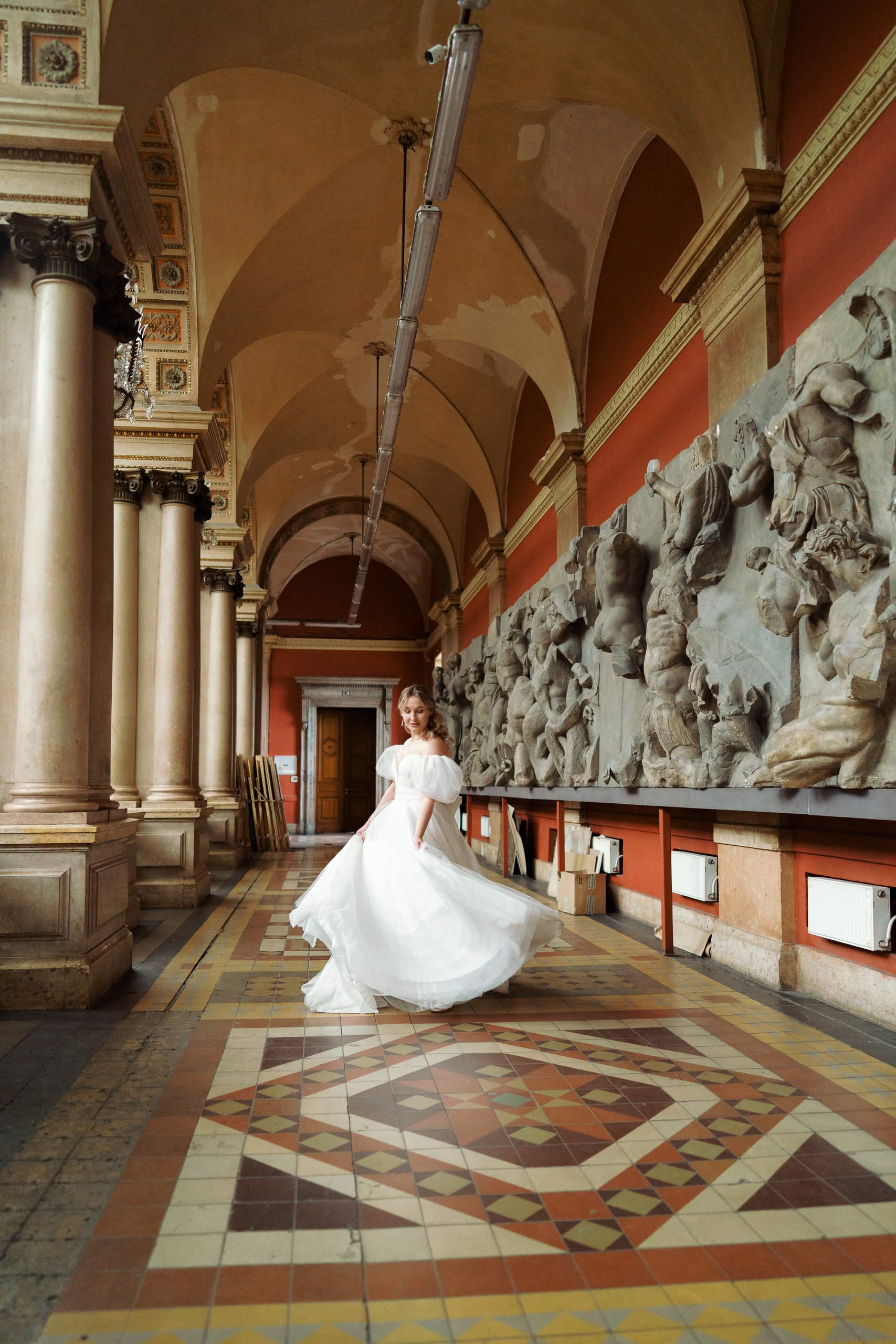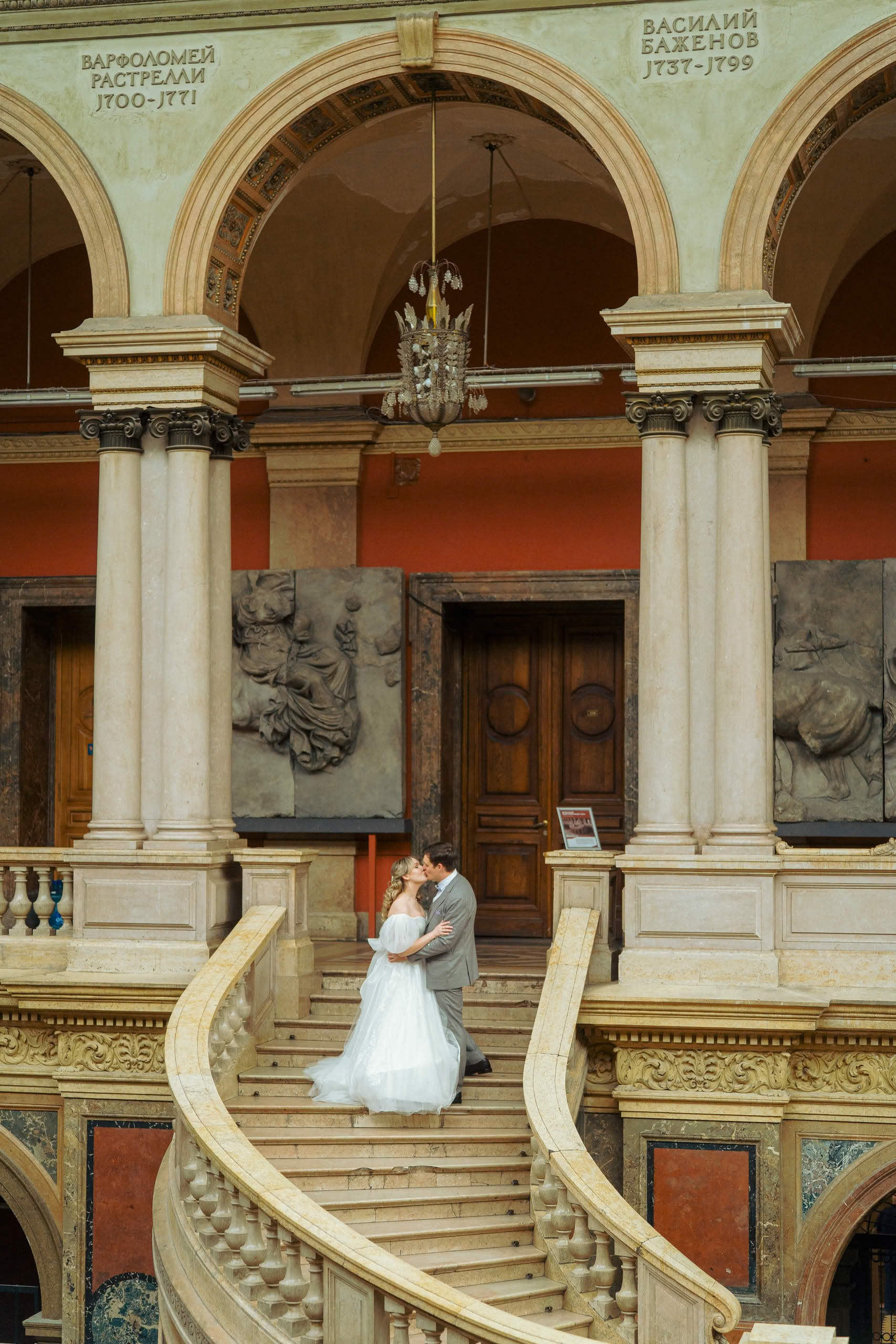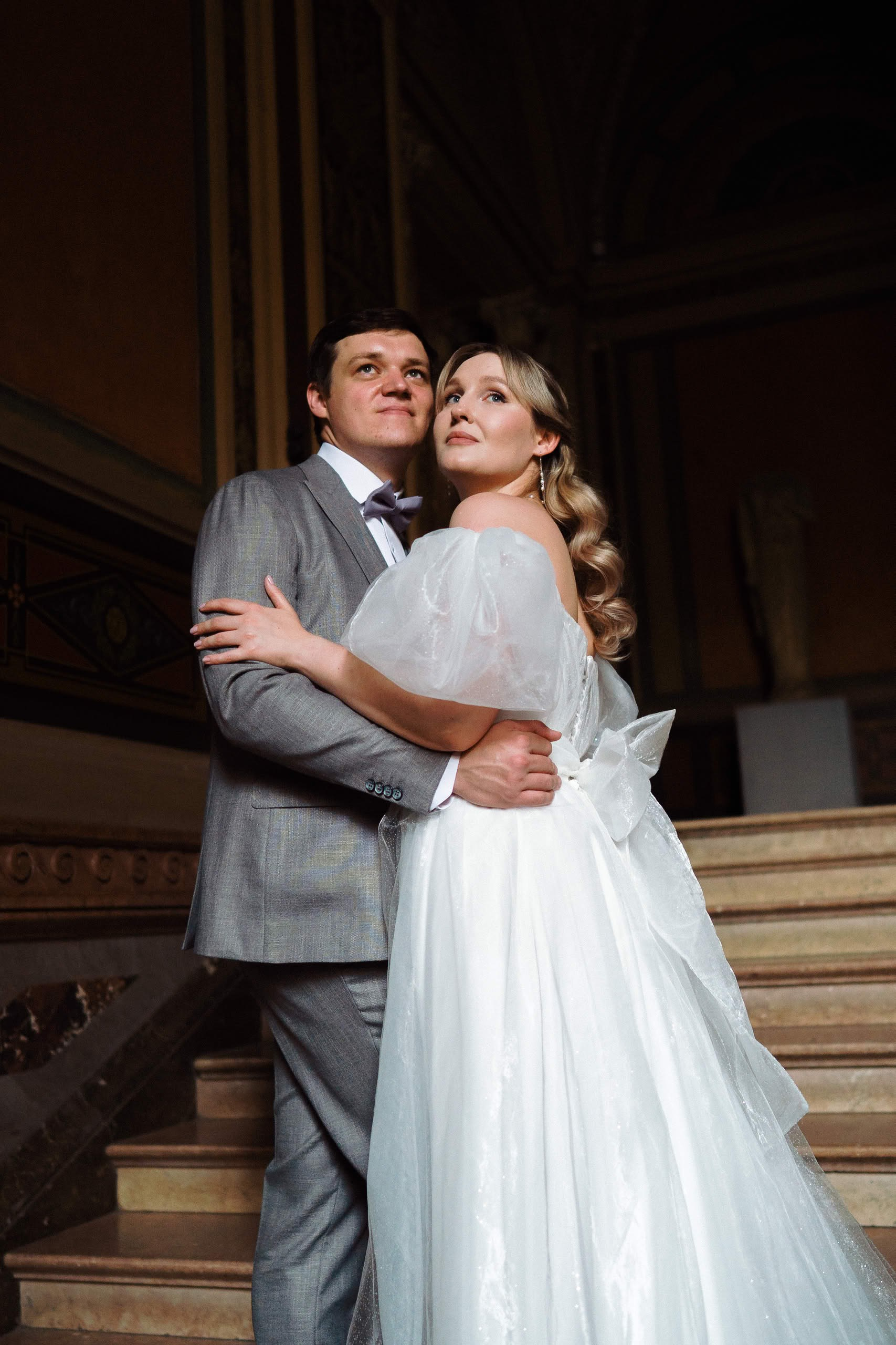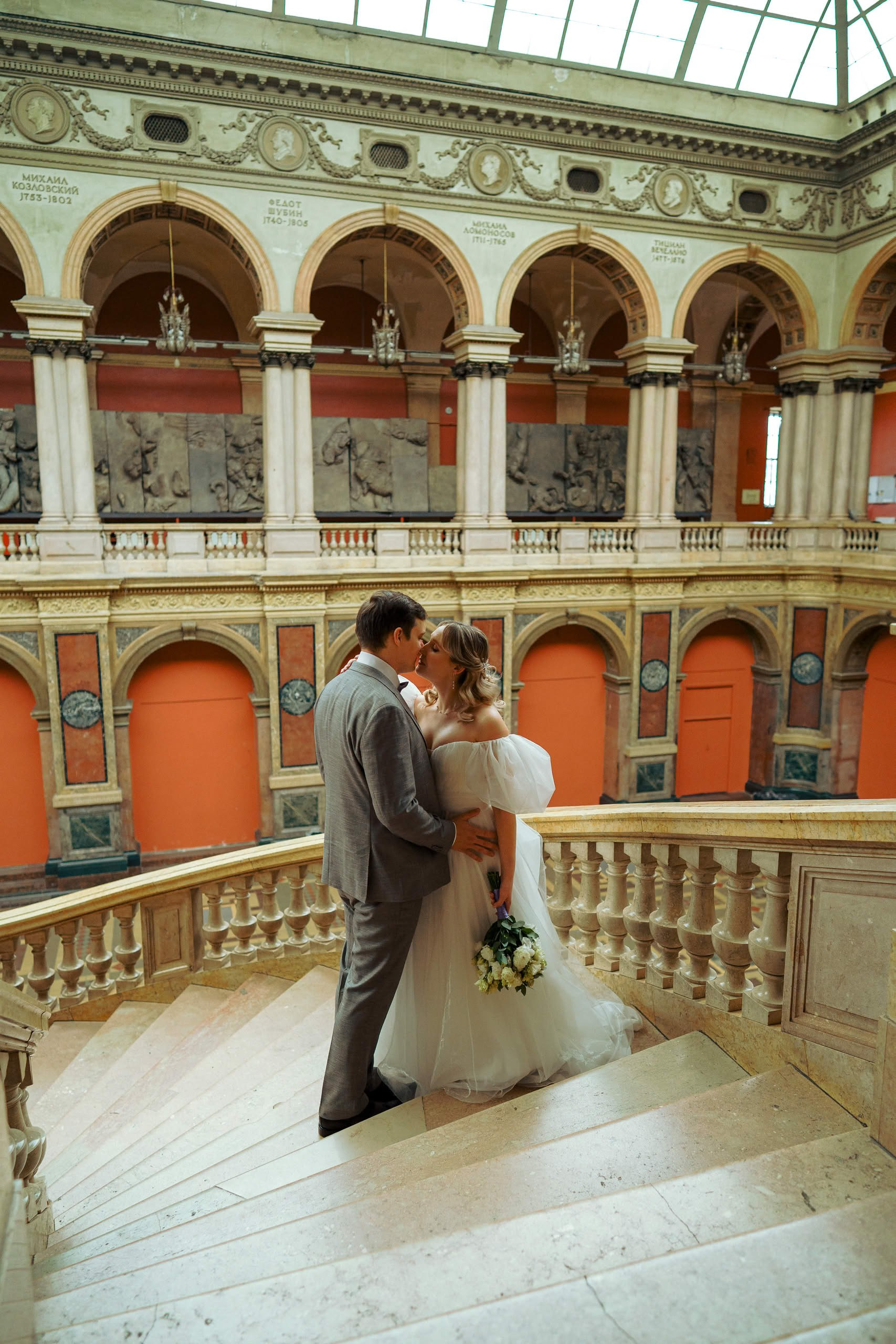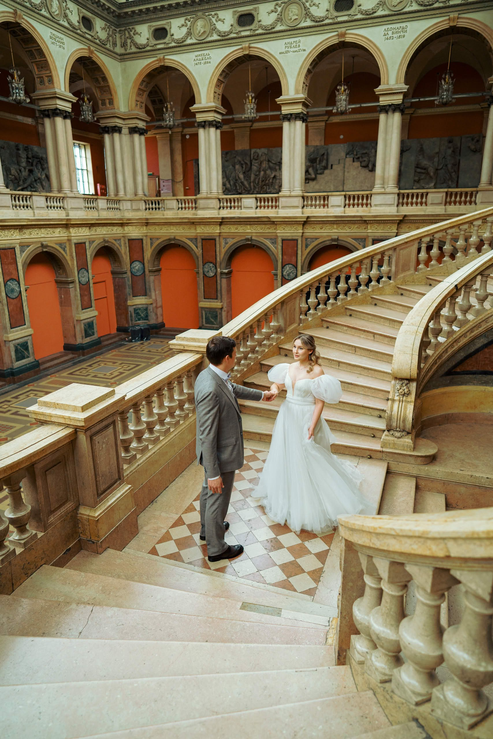 Мария и Алексей хотели классическую свадебную фотосессию, и Академия Штиглица с её светлыми залами, арками и классическими интерьерами стала идеальным выбором. Ребята арендовали зал, и на 15–20 минут у нас была уникальная возможность снимать почти наедине в этом огромном холле. Это создало особую атмосферу, когда пара чувствовала себя свободно и расслабленно.
