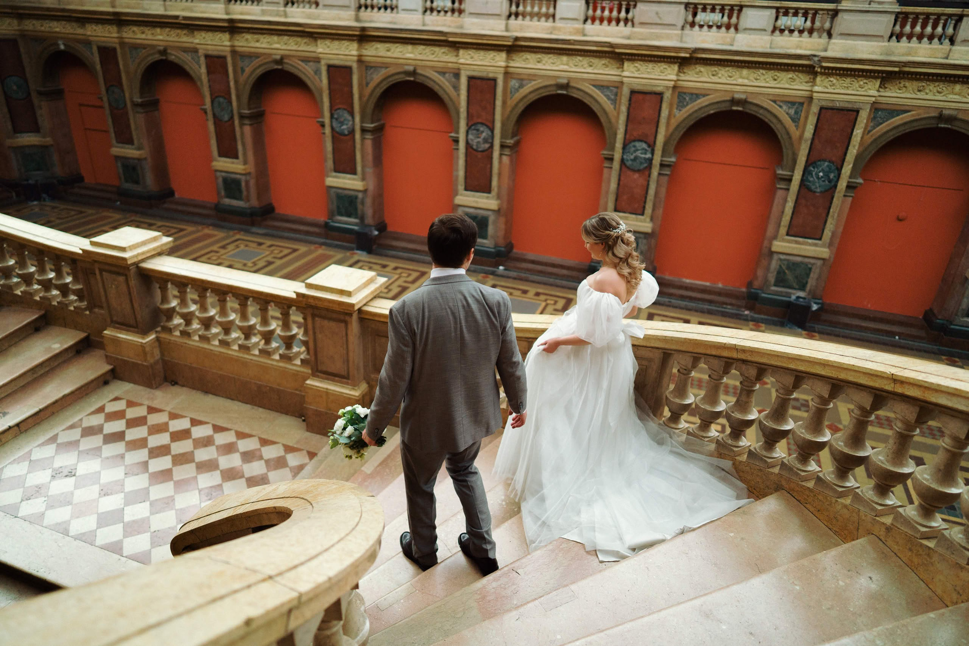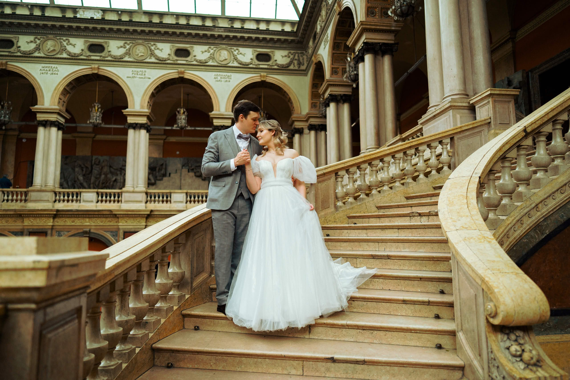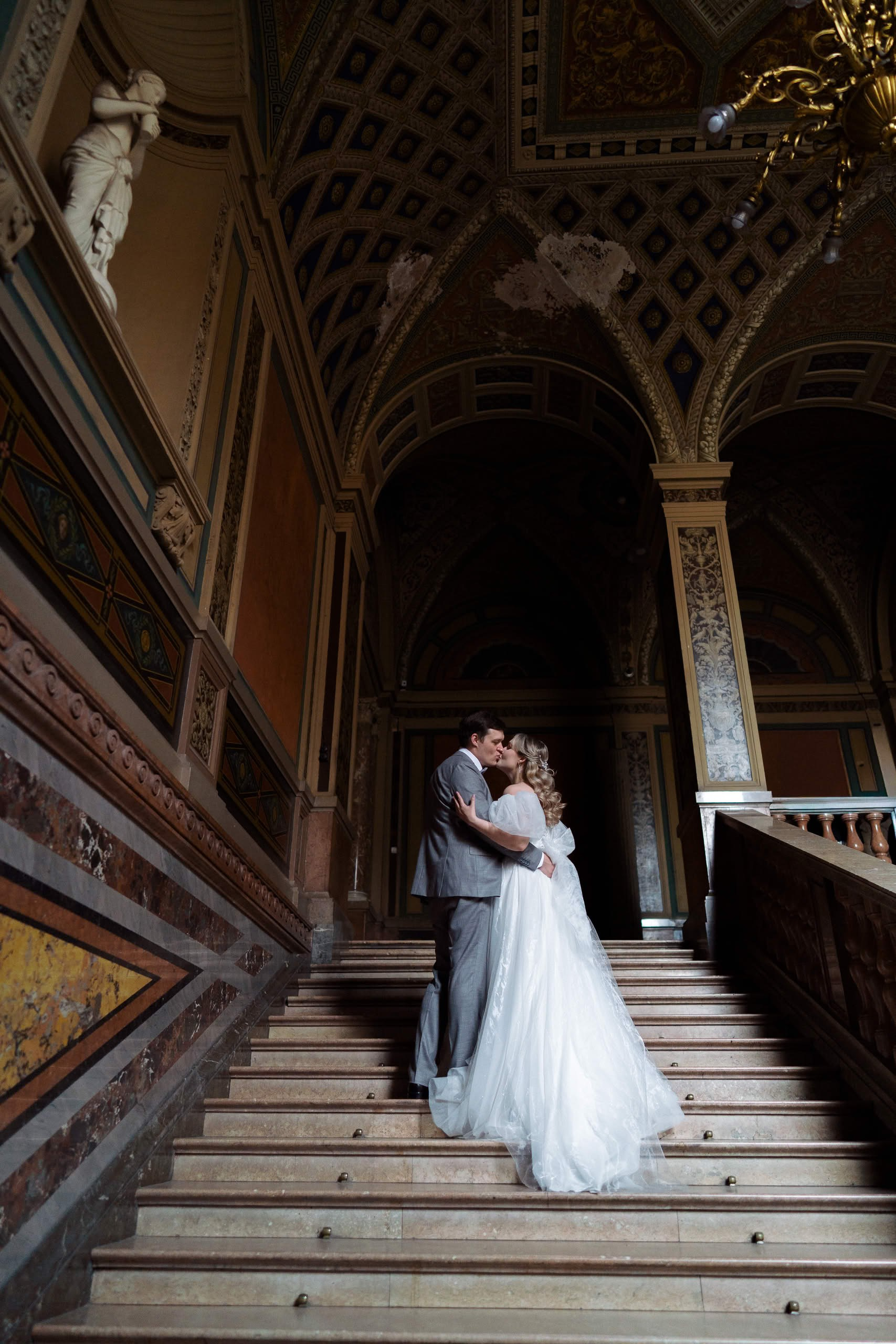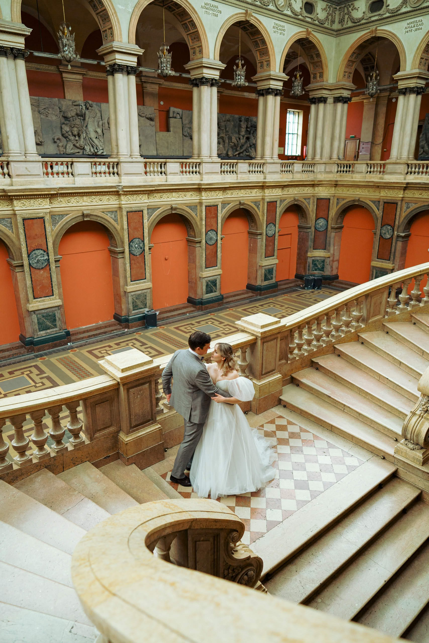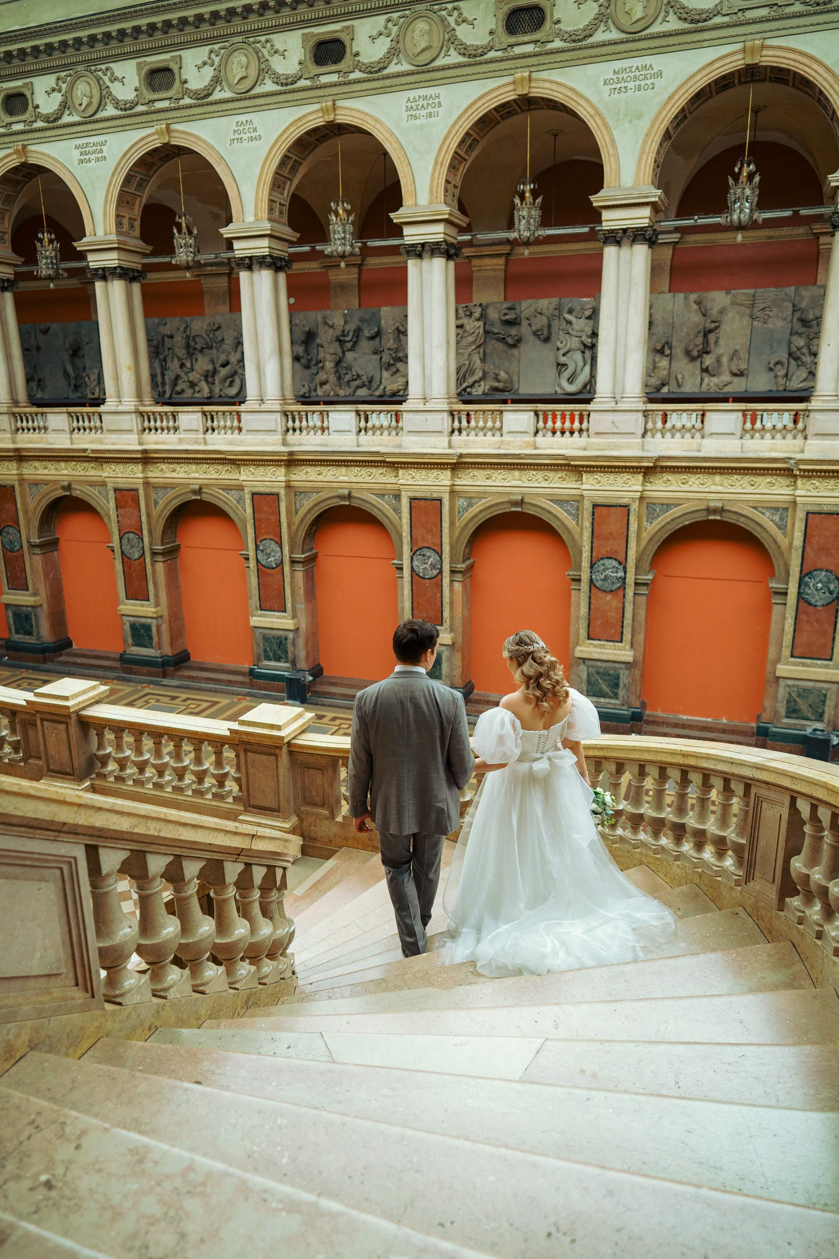 Мария и Алексей хотели классическую свадебную фотосессию, и Академия Штиглица с её светлыми залами, арками и классическими интерьерами стала идеальным выбором. Ребята арендовали зал, и на 15–20 минут у нас была уникальная возможность снимать почти наедине в этом огромном холле. Это создало особую атмосферу, когда пара чувствовала себя свободно и расслабленно.