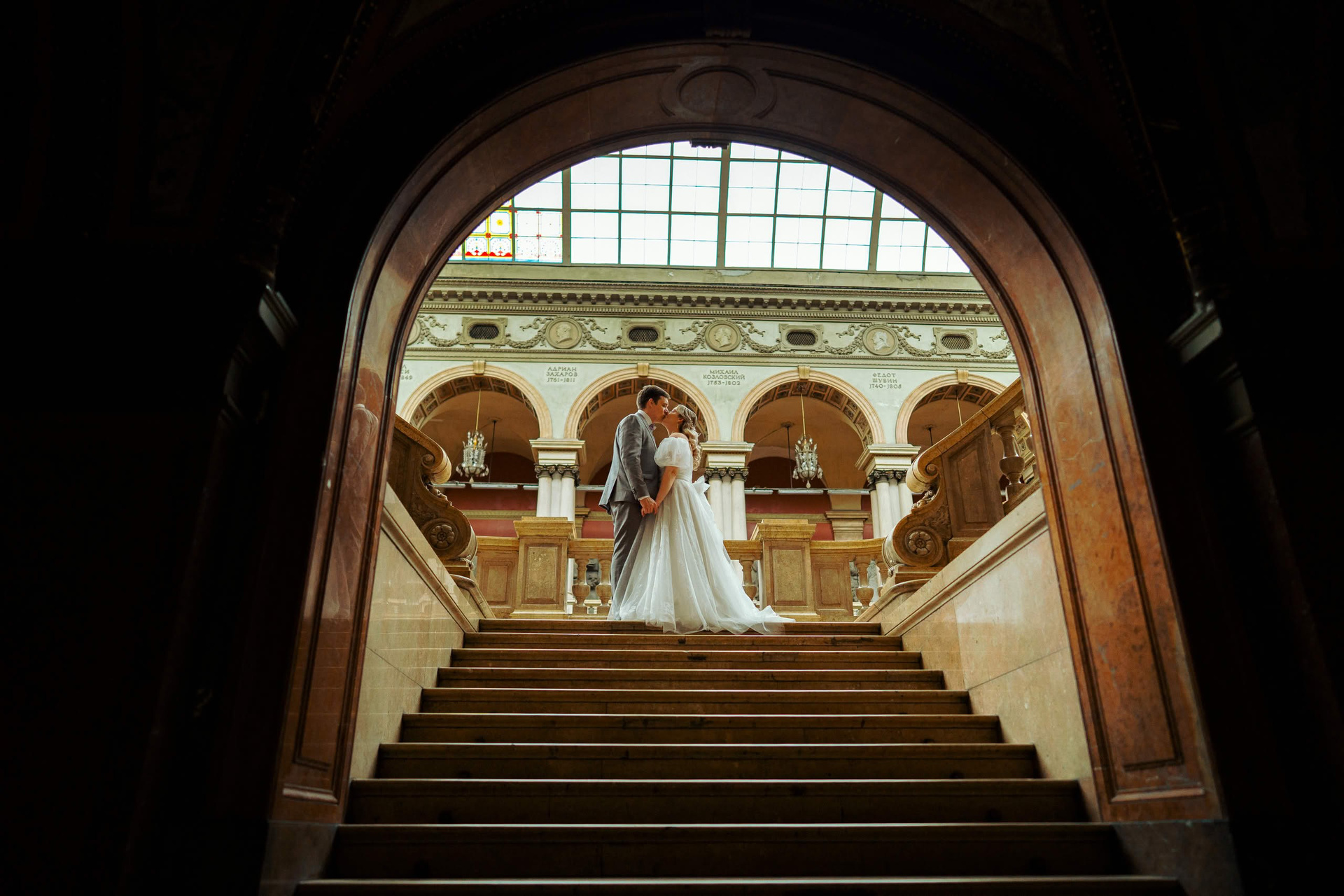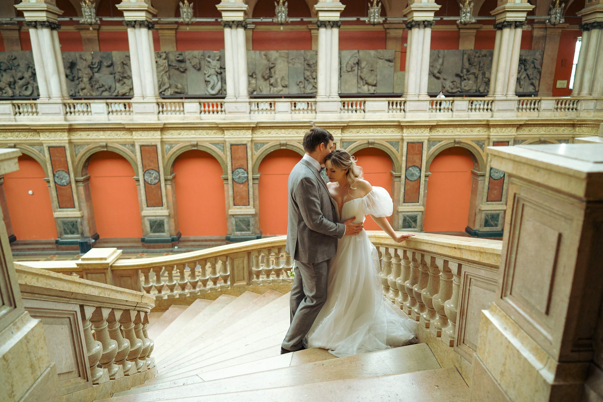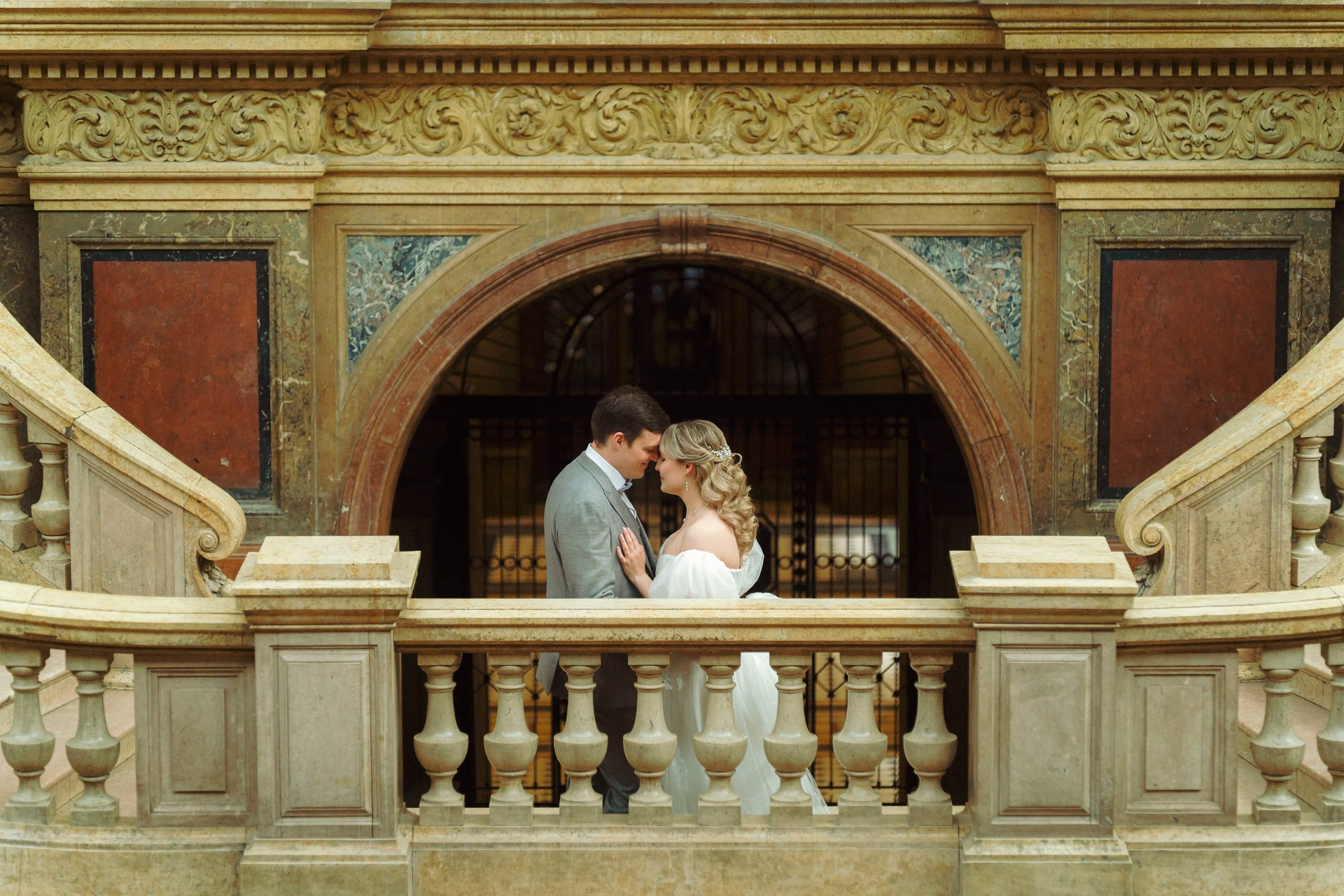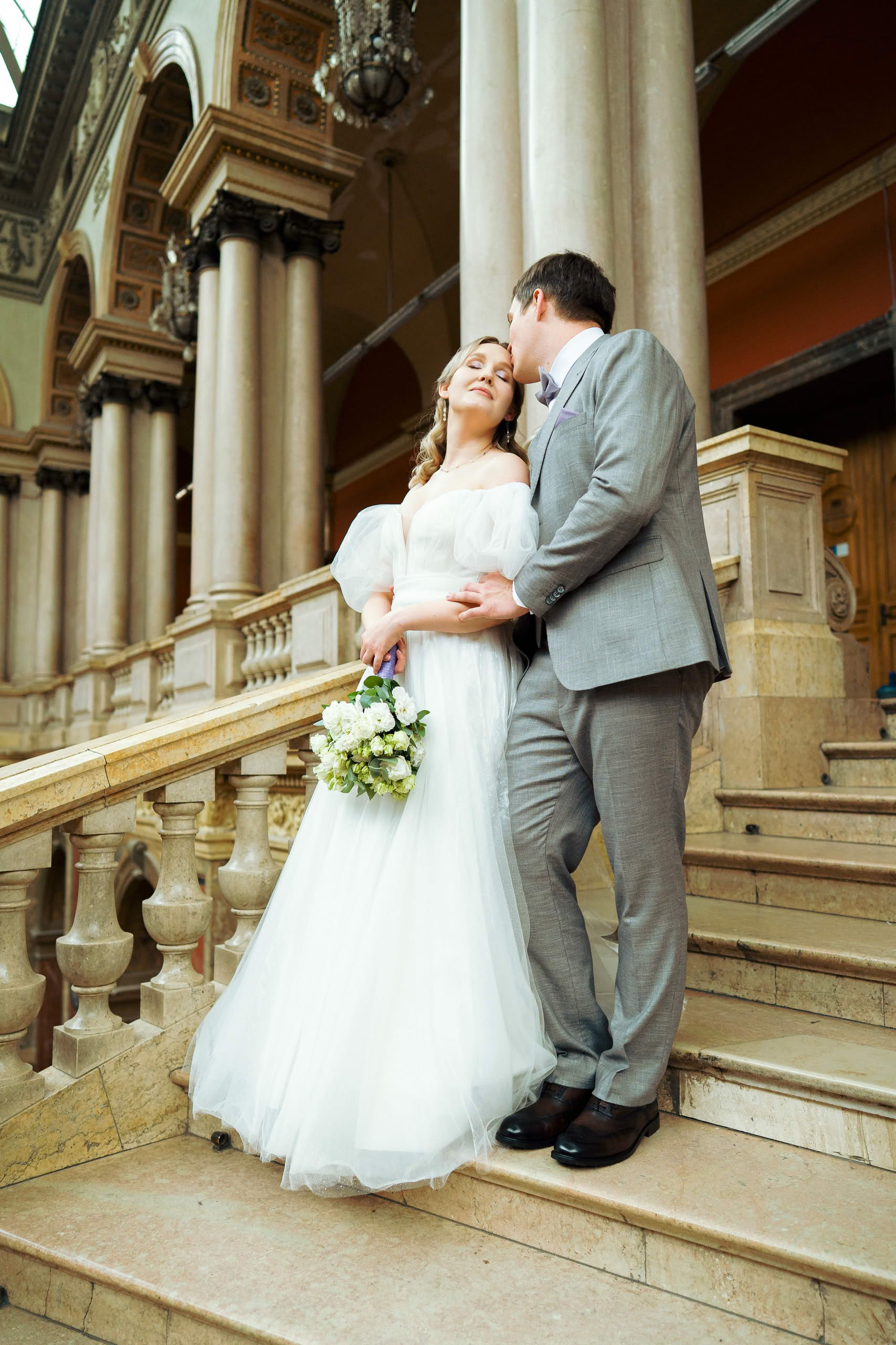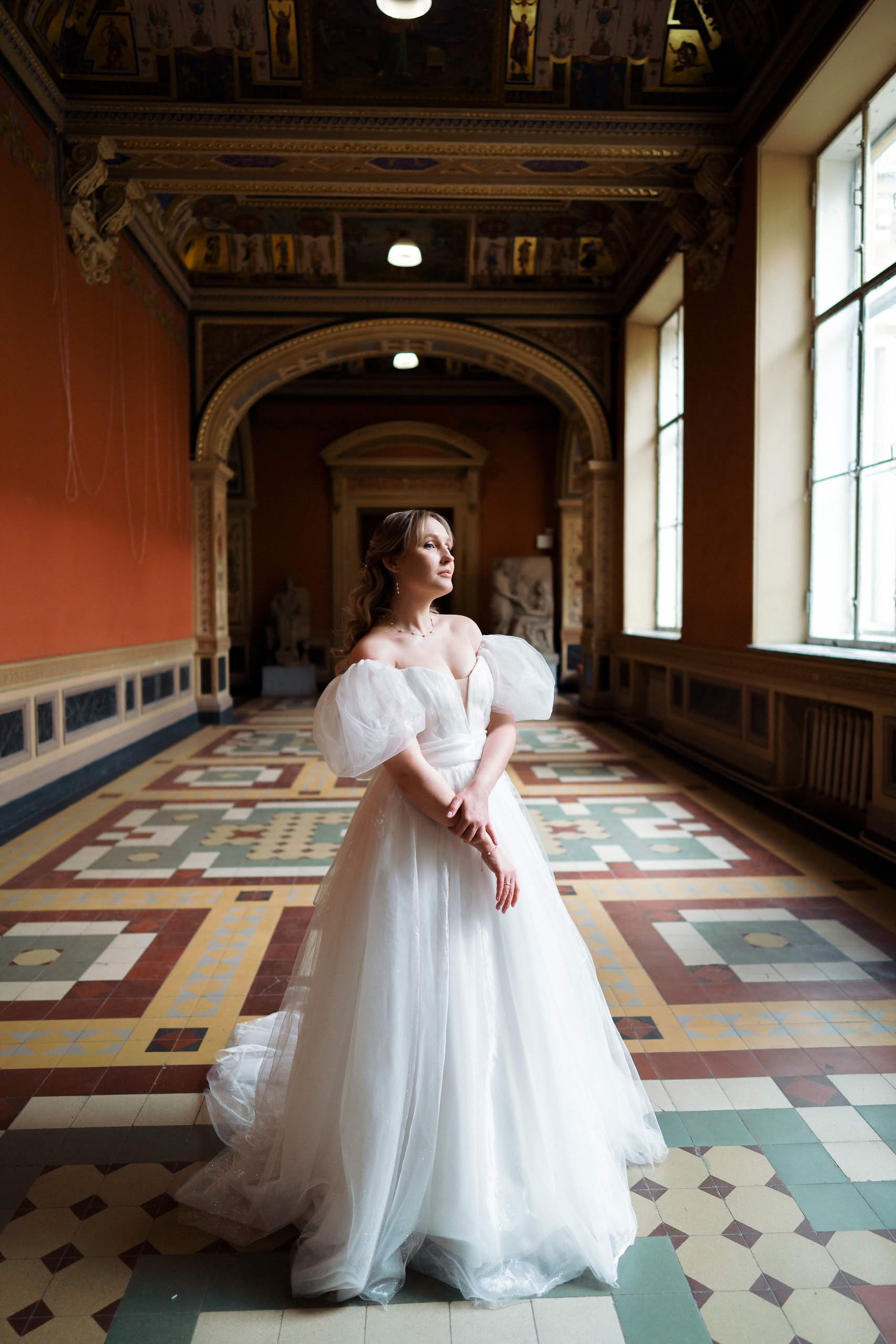 Мария и Алексей хотели классическую свадебную фотосессию, и Академия Штиглица с её светлыми залами, арками и классическими интерьерами стала идеальным выбором. Ребята арендовали зал, и на 15–20 минут у нас была уникальная возможность снимать почти наедине в этом огромном холле. Это создало особую атмосферу, когда пара чувствовала себя свободно и расслабленно.