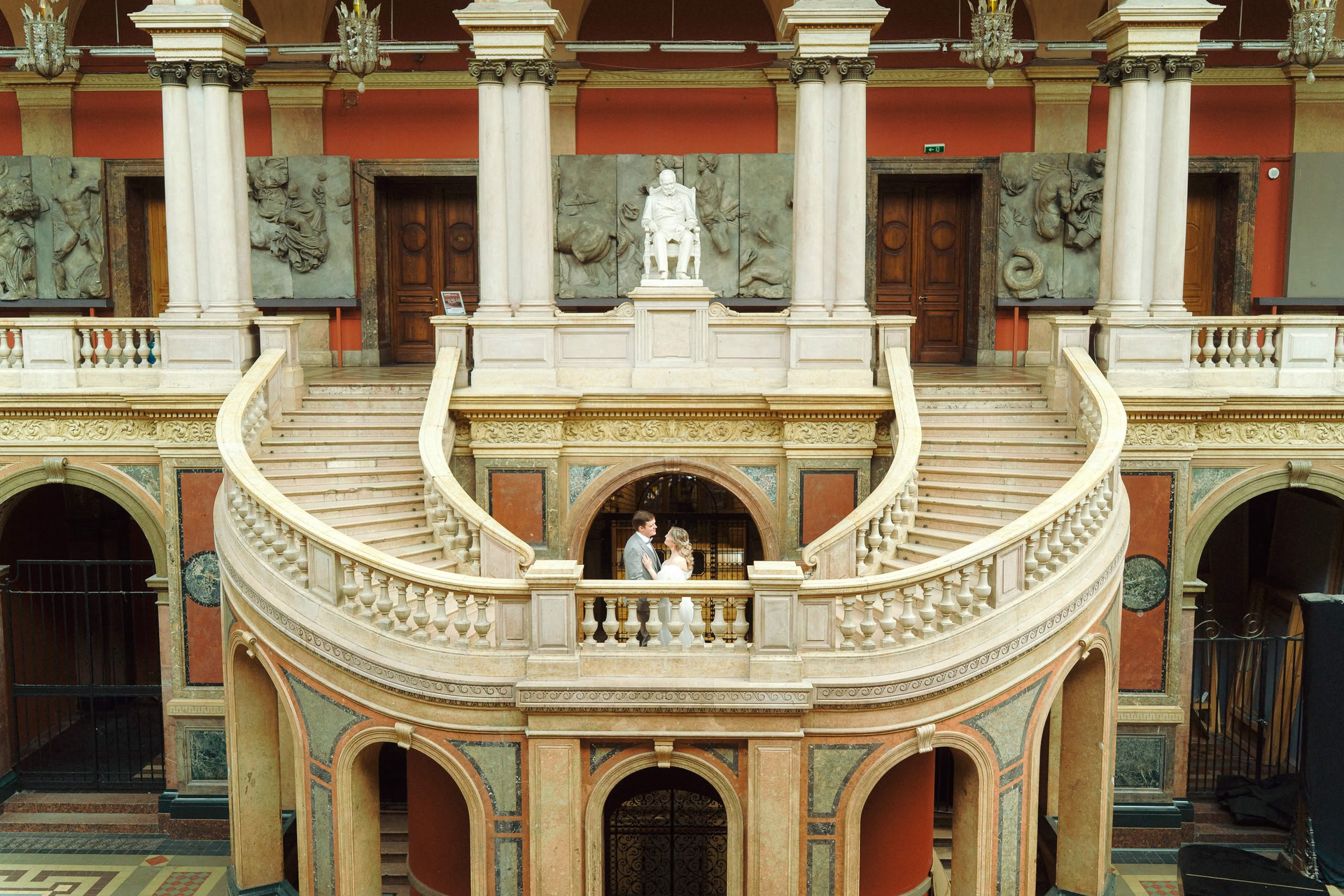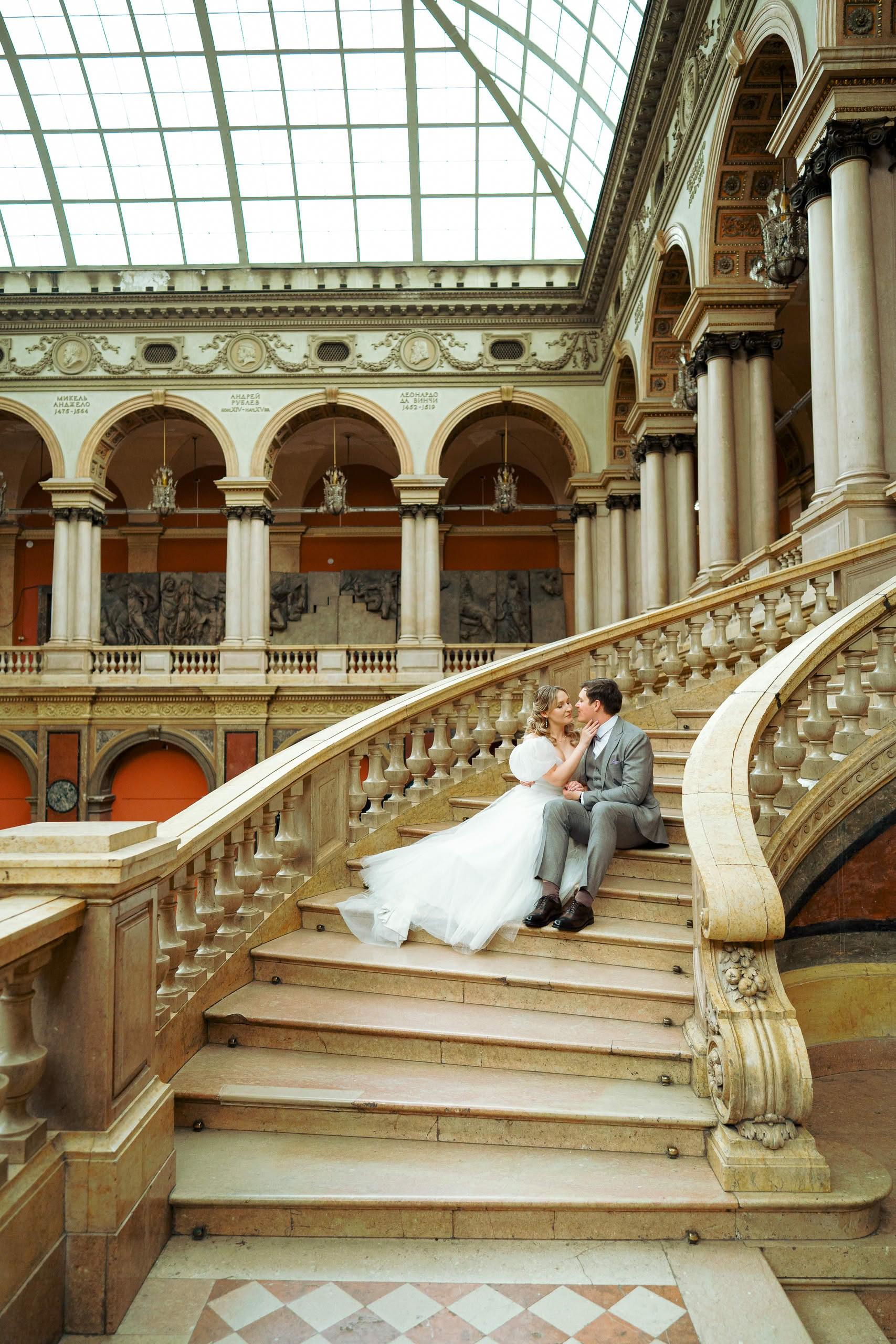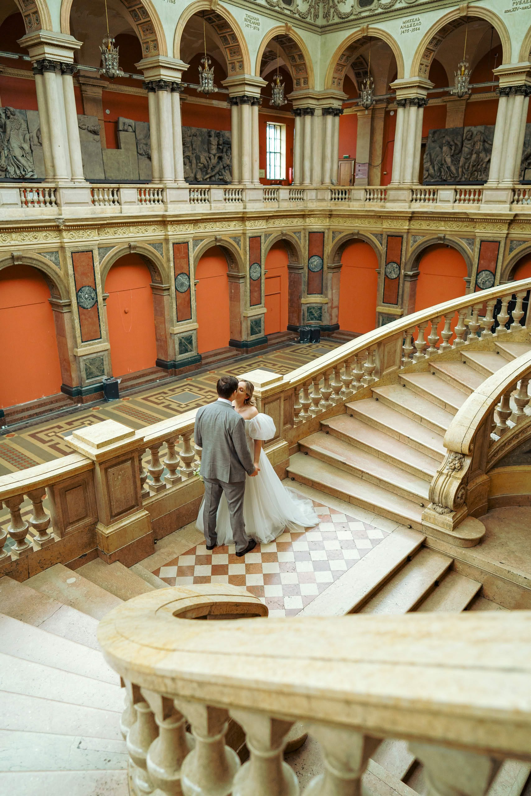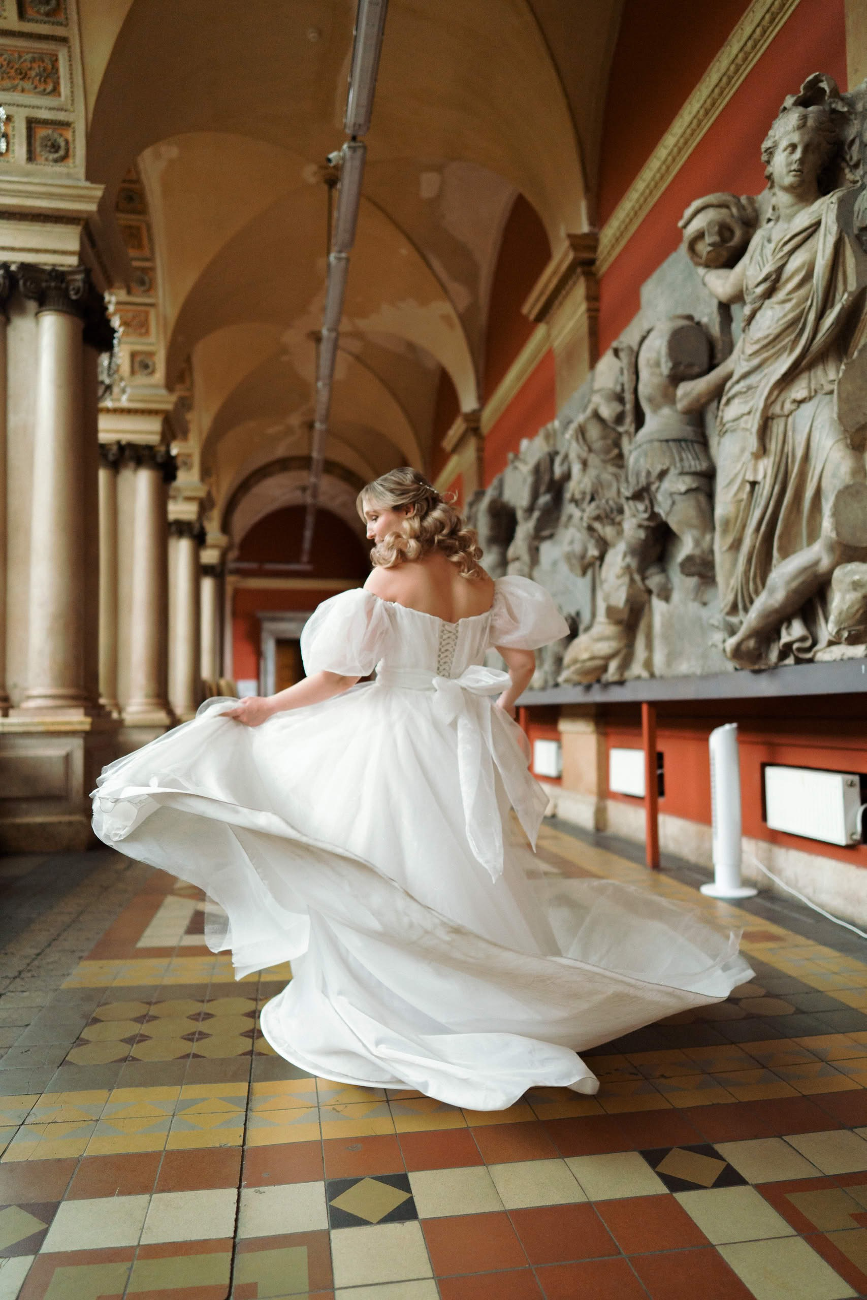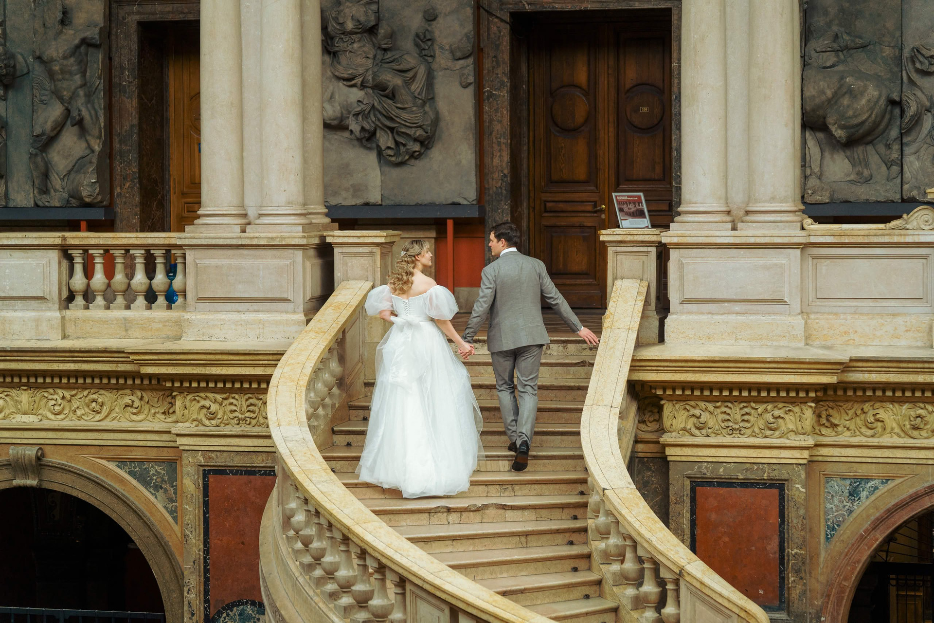 Мария и Алексей хотели классическую свадебную фотосессию, и Академия Штиглица с её светлыми залами, арками и классическими интерьерами стала идеальным выбором. Ребята арендовали зал, и на 15–20 минут у нас была уникальная возможность снимать почти наедине в этом огромном холле. Это создало особую атмосферу, когда пара чувствовала себя свободно и расслабленно.