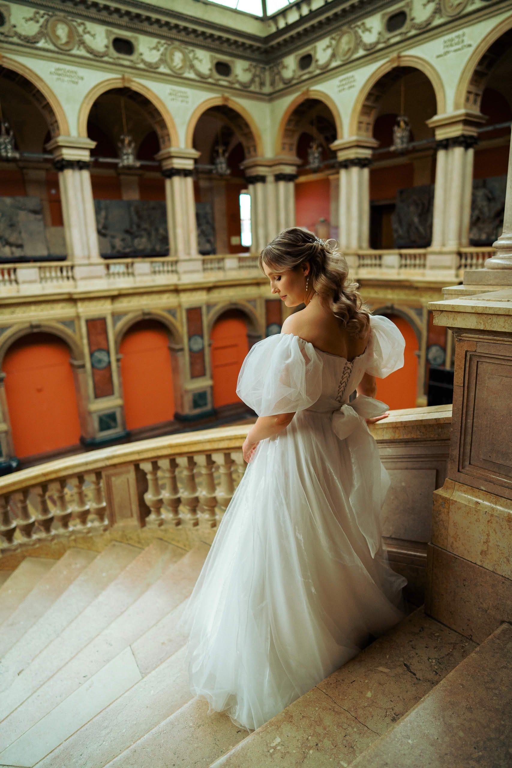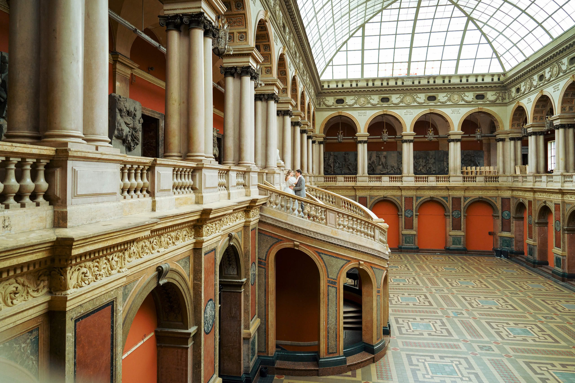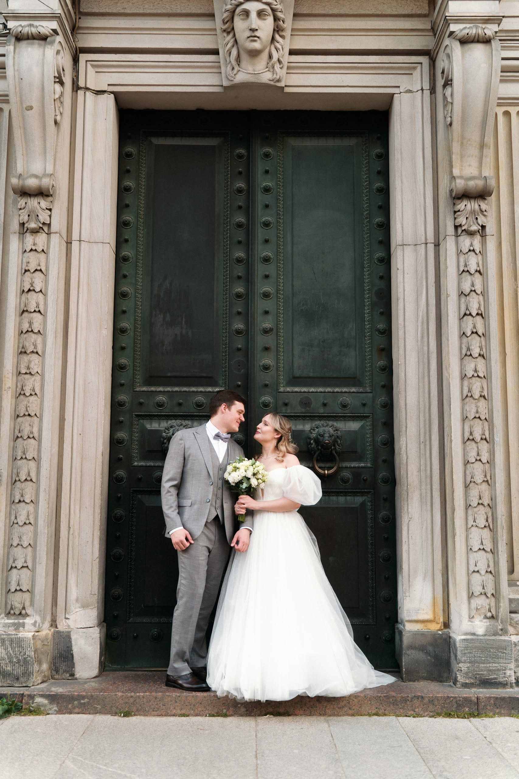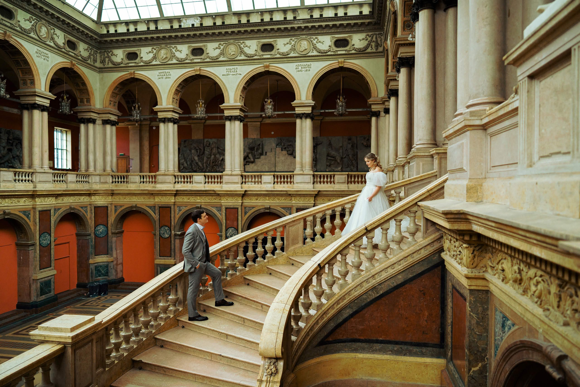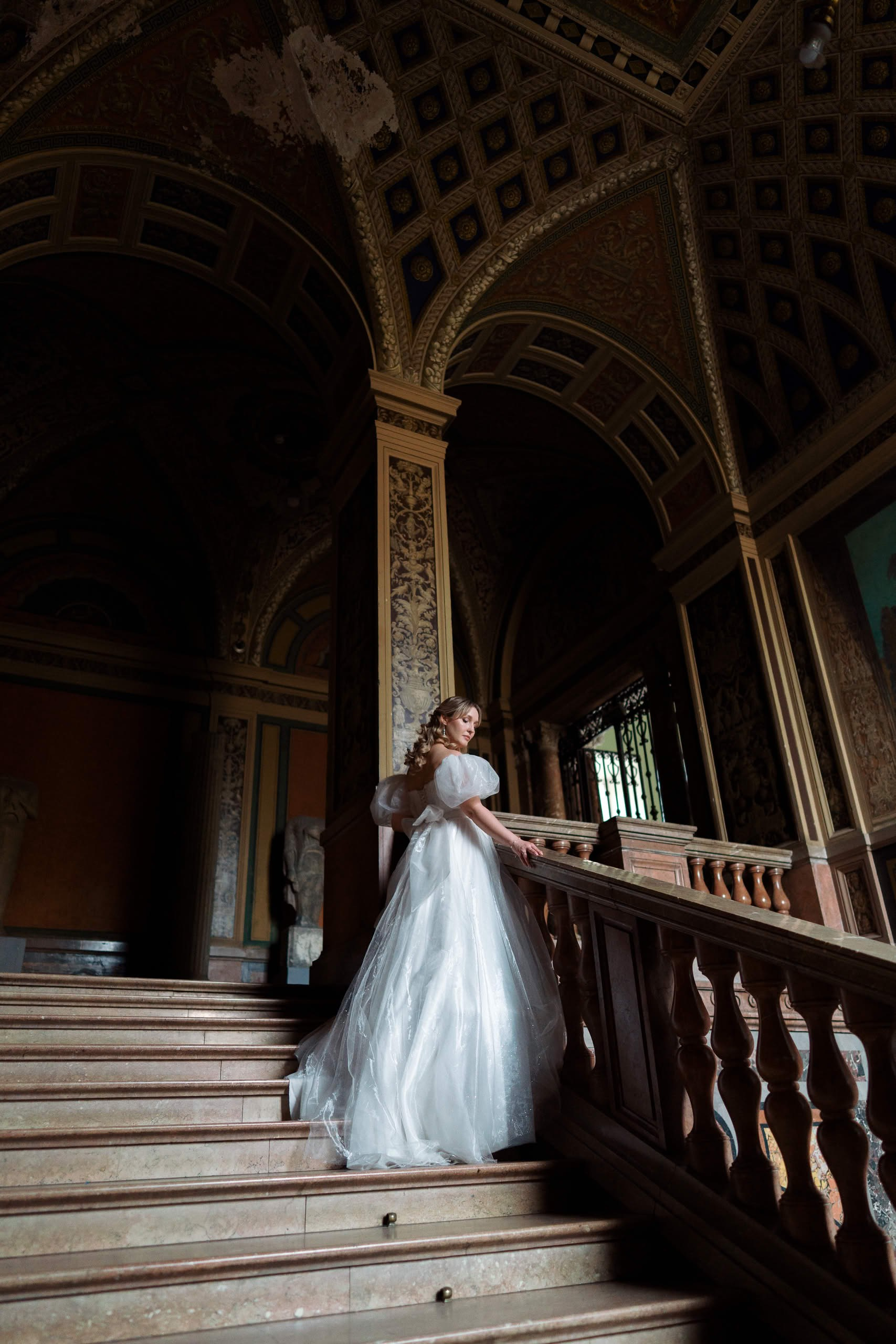 Мария и Алексей хотели классическую свадебную фотосессию, и Академия Штиглица с её светлыми залами, арками и классическими интерьерами стала идеальным выбором. Ребята арендовали зал, и на 15–20 минут у нас была уникальная возможность снимать почти наедине в этом огромном холле. Это создало особую атмосферу, когда пара чувствовала себя свободно и расслабленно.